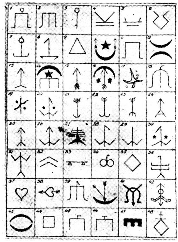 Приведем несколько старинных рисунков, взятых нами из [38]. На рис.4.14 показаны воины татарского польского полка первой половины XVIII века. На рис.4.15 - воины татарского полка времен Станислава Августа, конца XVIII века. На рис.4.16 показан головной убор татарского воина польских войск времен Наполеона. Такой убор - с полумесяцем и звездой - носили "воины ТАТАРСКОГО ЭСКАДРОНА НАПОЛЕОНОВСКОЙ ГВАРДИИ (! - Авт.)" [38], с.45. На рис.4.17 приведены гербы-тамги литовских татар.