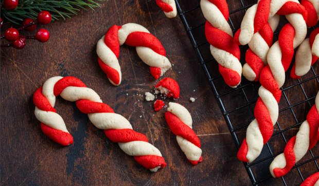 - Отщипните немного теста от каждой части. Руками скатайте из них 2 тонкие колбаски длиной примерно 12 см, сплетите их косичкой и придайте форму карамельной трости. Повторите, пока тесто не закончится.