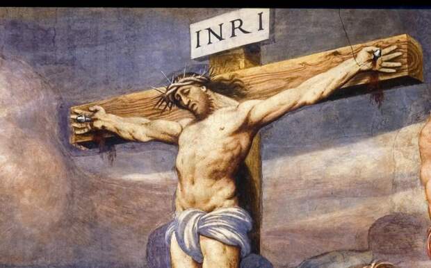 5) "Вокруг меча" были нанесены золотом письмена, указывающие, что тот, кто вытащит меч из-под наковальни, и есть король над всей землей английской. Но ведь это, скорее всего, отражение известной надписи, которую, согласно Евангелиям, палачи сделали на табличке, прибитой к кресту Христа, рис.7.5. Сказано: "И была над Ним надпись, написанная словами греческими, римскими и еврейскими: Сей есть Царь Иудейский" (Лука 23:38). В обеих версиях суть дела одна и та же: надпись говорила о Царе. Либо страны Иудеи, либо Англии. Однако, как мы показали, "Англия" того времени как раз и есть Иудея - Царь-Градское Царство XII века.