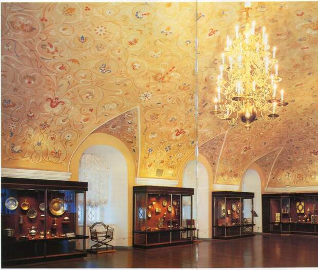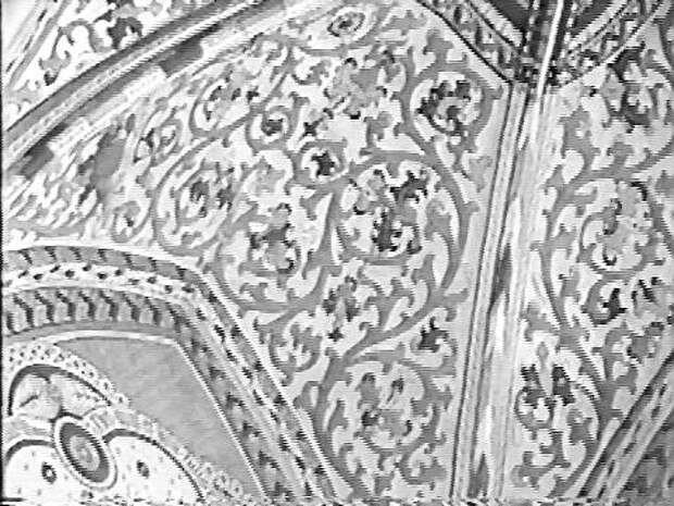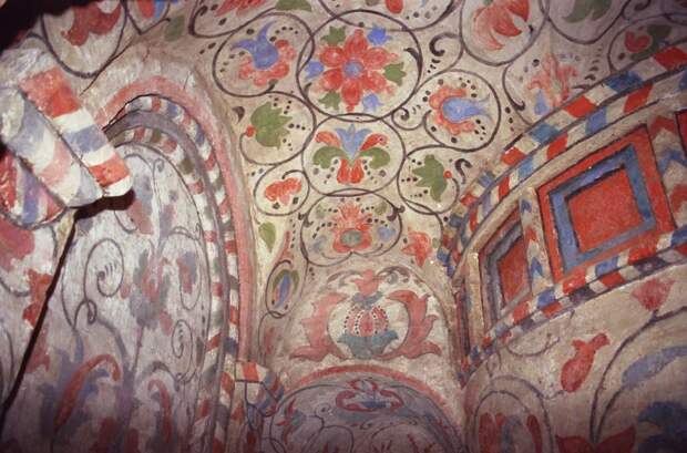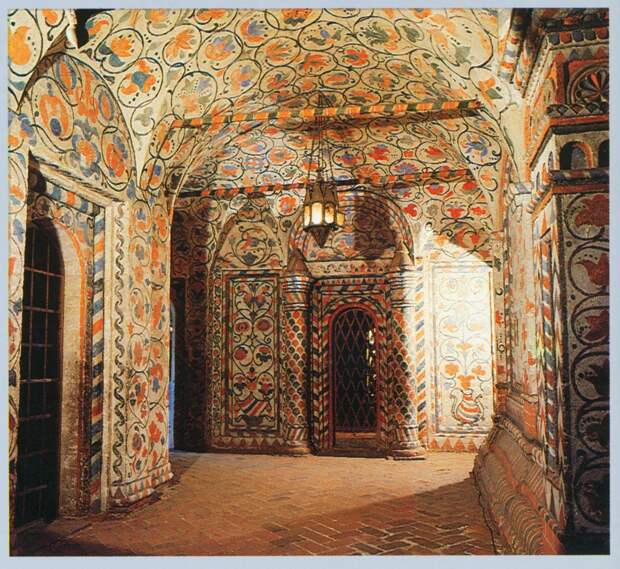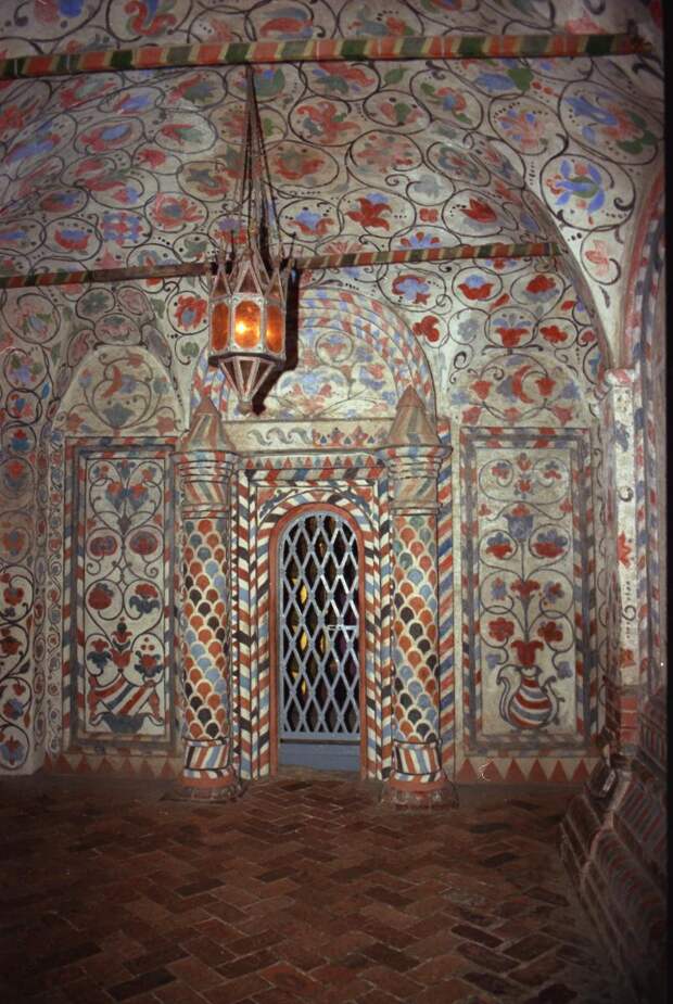 . Его старая роспись, сохранившаяся до сих пор на значительной части площади его стен и сводов (считается, что ее восстановили уже в новое время), резко отличается от привычной нам росписи православных храмов. Это - ЧИСТЫЙ ОРНАМЕНТ. Никаких людей, птиц, животных. Возможно, в ту эпоху XV-XVI веков нача'ла разделения православия и мусульманства, такие ограничения некоторое время существовали и на Руси. Аналогичную "растительную роспись" мы видим и в Крестовой Палате Московского Кремля, рис.4.11b