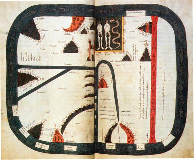 показана старинная всемирная карта якобы 1109 года, на которой ВСЕ МОРЯ ИЗОБРАЖЕНЫ ДЛИННЫМИ УЗКИМИ РЕКАМИ. Более того, в виде узкой реки представлен даже огромный Океан, омывающий Землю.