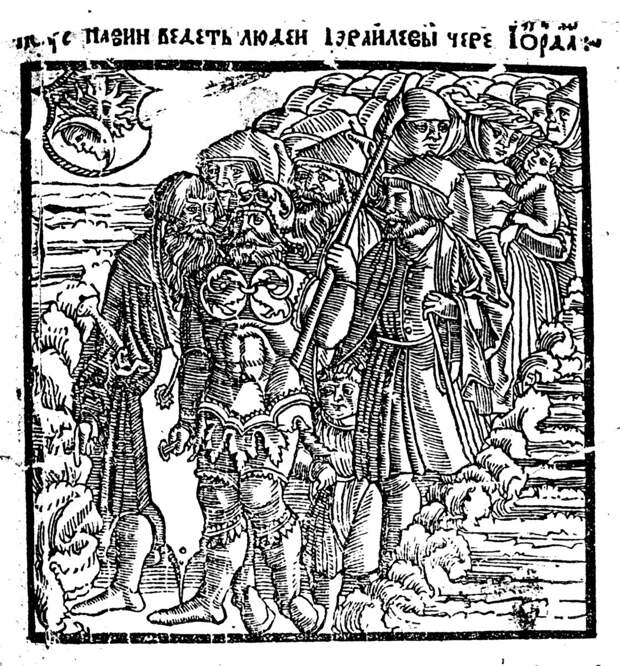 приведена старинная гравюра из Библии Скорины, показывающая переход израильтян=богоборцев через реку Иордан.