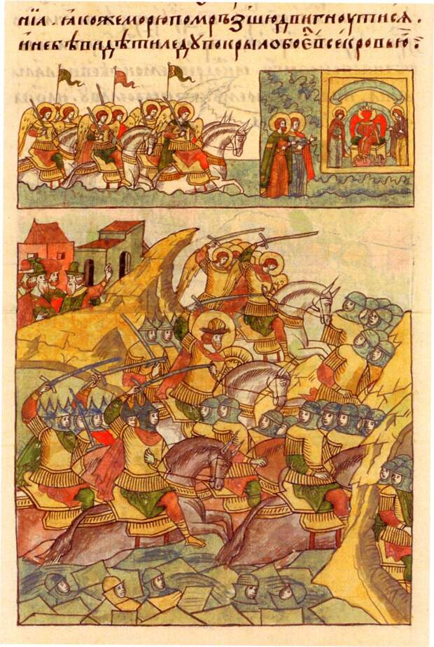 Напомним теперь подробности Ледового Побоища. Великий князь Александр Невский воюет с ливонскими немцами. Вот что сообщает Холмогорская летопись: "Александр постави воя своя на озере Чюдском, на Узмениа, у ВОРОНЬЯ камени, и ста противу их, исполчися. И наступиша на озеро то Чудское... Тогда бысть сеча зла над немци и чудь, тако без страшно, ЯКО ОЗЕРУ ПОДВИГНУТИСЯ ИЗМЕРШУ. Видеша же верни ПОЛКИ БОЖИА, ПОМОГАЮЩУ АЛЕКСАНДРУ. И тако ПОБЕГОША НЕМЦИ, И ГНАША ИХ ПО ОЗЕРУ, биюще семь верст ПО ЛЬДУ... Паде немец 531, чудь бесчисленное множество... МНОЗИ ЖЕ ИСТОПОША НА ОЗЕРЕ. Бе же се АПРЕЛЯ 5 ДЕНЬ" [931], с.69. Холмогорская летопись датирует битву 1242 годом.
