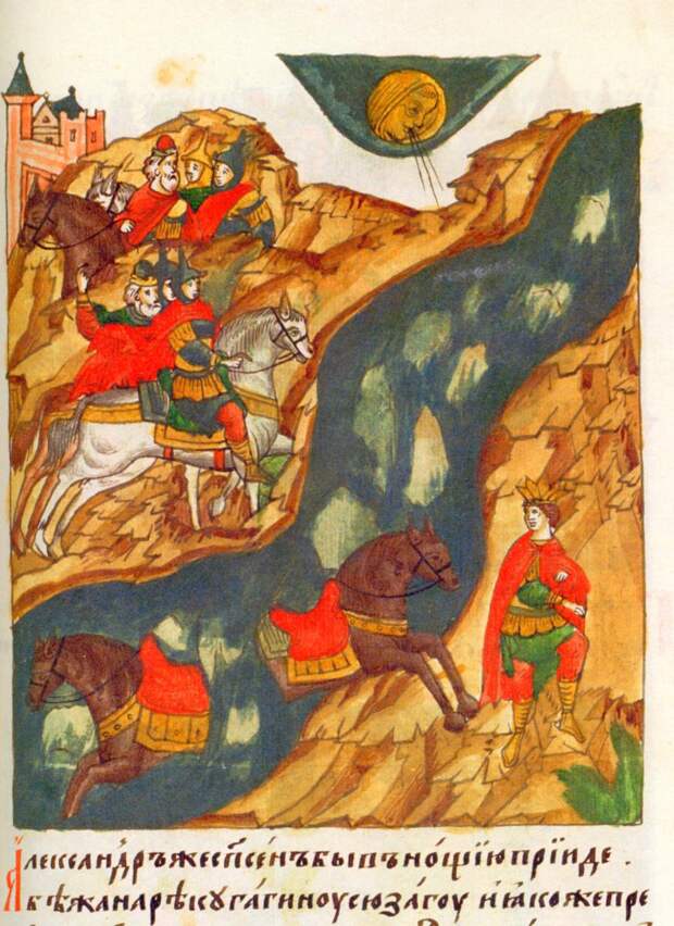 Практически то же самое сообщает и Русский Лицевой Свод. "Александр чудесно спасся той ночью, бежав до реки Страгга. И, чтобы перебраться на тот берег, Александр спустился к реке, когда же конь поставил копыта на лед, ТОТ ТРЕСНУЛ, ПОДТОПЛЕННЫЙ ДНЕВНЫМИ ЛУЧАМИ СОЛНЦА. ПРОВАЛИВШИСЬ ПОД ЛЕД, КОНЬ БЫЛ ПОХИЩЕН ВОДОЮ, а Александр сумел выбраться на сушу. Когда персы, осуществлявшие погоню, подошли к реке... река стала непреодолимою преградой на пути людей" [490:4], Всемирная История, книга 3, с.169. См. рис.4.8a
