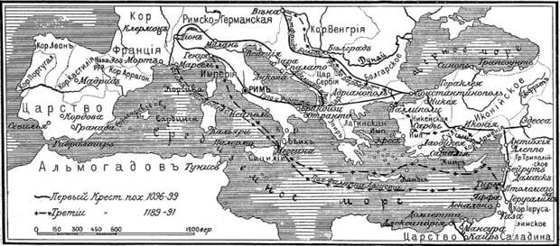 Крестовые походы 1096–1099 и 1189–1191 годов (рисунок из статьи «Крестовые походы» «Военная энциклопедия Сытина»; 1913 год)