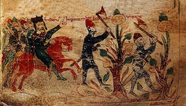 Фридрих Барбаросса в крестовом походе. Миниатюра рукописи Петра из Эболи, конец XII в.