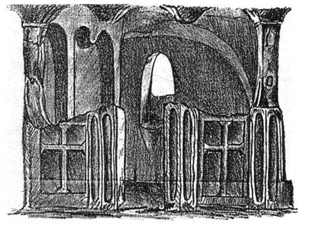 <<В книге А.В.Попова "Вторая учебная экскурсия Симферопольской мужской гимназии в Бахчисарай" (1888 г.) читаем: "Все повернули влево и стали подниматься по довольно крутой тропинке... Направо по входе в ворота, при разделении дорог, были осмотрены ОСТАТКИ ПЕЩЕРНОЙ ЦЕРКВИ, по указанию сторожа, по его словам, здесь была живопись, ВОЗЛЕ ЦЕРКВИ УСЫПАЛЬНИЦА... В церкви алтарная часть полукруглая, в тех местах, обратил внимание гул пустоты".