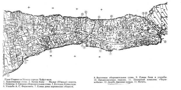 Вот он, Чуфут-кале, Кырк-Ор, Топрак-кала, Бутмай, Гевхер-кермен. Названия менялись вместе с эпохами жизни населения. Последнее (Гевхер-кермен - Авт.) может быть переведено как "крепость драгоценностей". Эвлия Челеби так объясняет его: "...татарские улемы дали ему название Гевхер-кермен. ВЕДЬ В ТЕ ВРЕМЕНА ВСЕ ВОРОТА, СТЕНЫ И КАЛИТКИ ЗАМКА БЫЛИ УКРАШЕНЫ ДРАГОЦЕННЫМИ КАМНЯМИ">> [164], с.6.