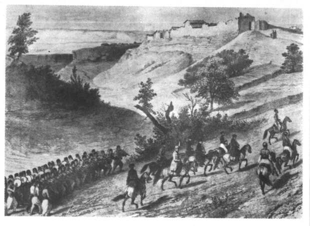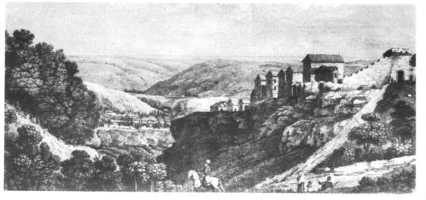 приведена старинная гравюра, показывающая прибытие к Чуфут-Кале знатных путешественников. Путь к городу описывали, в частности, так.