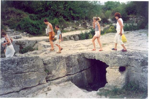 Пройдем мимо Успенского монастыря... Место, с которого начинается путешествие в древность, мало приметно на оживленной туристской тропе. На склоне (ущелья Марьям-Дере - Авт.) в зарослях кизила и лощины скрыт ДРЕВНИЙ МОГИЛЬНИК то ли жителей поднебесного города (Чуфут-Кале) - Авт.), то ли села, располагавшегося здесь поблизости...