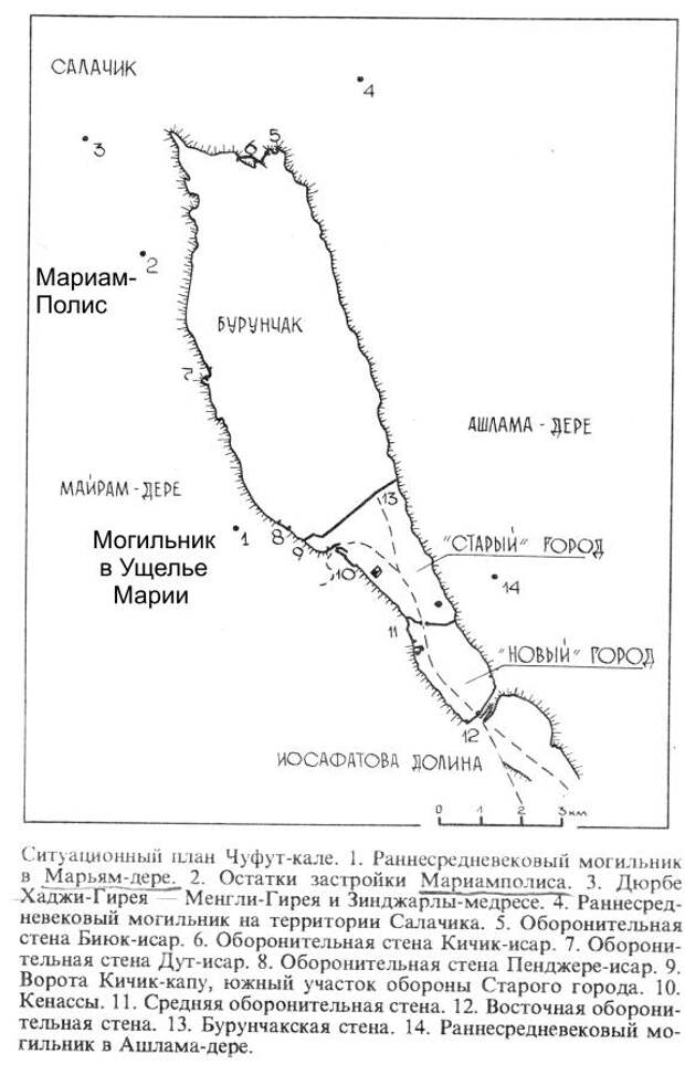 - план самого Чуфут-Кале. Старинный город расположен на большом и высоком плато. Оно окружено глубокими ущельями. Доступ в город ранее был сильно затруднен. Для нас важно, что рядом с Чуфут-Кале находится, оказывается, ущелье, старое название которого - Марьям-дере. То есть Ущелье Марии [164], с.5. Кстати, слово ДЕРЕ является, вероятно, вариантом произношения славянского слова ДЫРА. Вполне естественно, что первые обитатели этих мест именовали УЩЕЛЬЕ - ДЫРОЙ. Таким образом, в непосредственной близости от Чуфут-Кале находится ущелье, названное именем Марии. Более того, тут были обнаружен христианский некрополь с многочисленными захоронениями в склепах.
