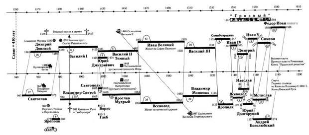 Согласно династическим параллелизмам, см. нашу книгу "Новая хронология Руси", Владимир Святой является, в основном, отражением царя-хана Василия I при сдвиге на 410 лет, см. рис.p2.1. Поэтому известное крещение Руси в конце X века в значительной мере является отражением крещения Великой = "Монгольской" Империи в конце XIV - начале XV века. Об этих событиях мы подробно рассказываем в следующей нашей книге "Крещение Руси".