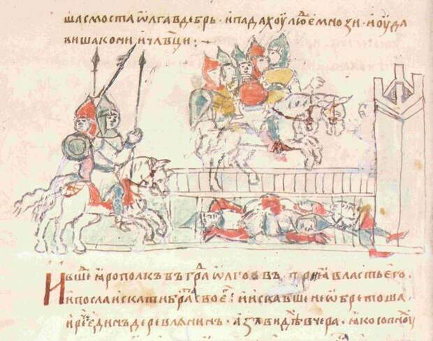 Кстати, зададимся вопросом - есть ли в биографии Ярополка отражение того факта, что Иоанн Креститель КРЕСТИЛ НАРОД В РЕКЕ. В чистом виде такого "водяного сюжета" в доступных нам летописях мы не нашли, однако некое его глухое отражение обнаружилось в конце биографии Ярополка. Непосредственно перед уже изложенным выше сюжетом о коварном убийстве Ярополка рассказывается о сражении Ярополка с Олегом. Олег и его войска, преследуемые Ярополком, оказались НА МОСТУ ЧЕРЕЗ ПЛОТИНУ, расположенном ПРЯМО ОКОЛО СТЕН ГОРОДА Овруча. Любопытно, что ни о каком сражении на самом деле здесь уже не говорится, а описывается следующее событие, причиной которому был именно Ярополк: масса народу оказалась в реке около города, будучи туда спихнута. Татищев рассказывает: "БЫЛ МОСТ ЧЕРЕЗ ПЛОТИНУ КО ВРАТАМ ГОРОДСКИМ. ВОЙСКО ЖЕ, ТЕСНЯСЬ, СПИХИВАЛИ ДРУГ ДРУГАИ ВО МНОЖЕСТВЕ УТЕСНЯЮЩИХСЯ СПИХНУЛИ САМОГО ОЛЕГА, И НА НЕГО ПАДАЛИ МНОГИЕ ЛЮДИ И С КОНЯМИ... Ярополк, войдя в град... послал тотчас к ПЛОТИНЕ, где трупы таскали от утра до полудня; едва сыскали его (Олега - Авт.) скрытого под трупами множества людей (утонувших в реке - Авт.) и коней УТОПШИХ и, вынув, положили его на ковре" [832:1], т.2, с.42.