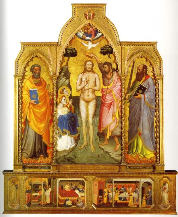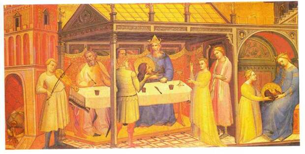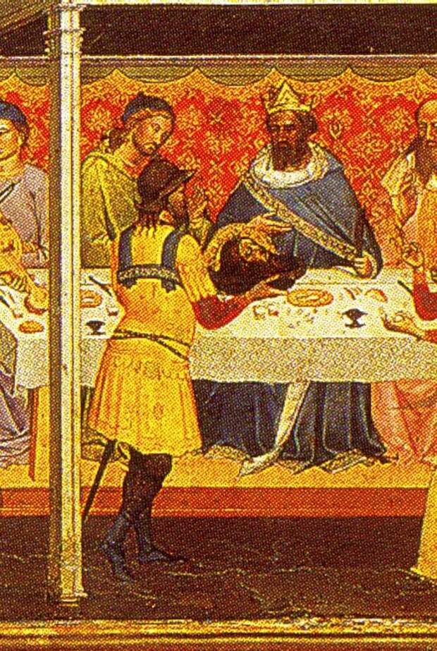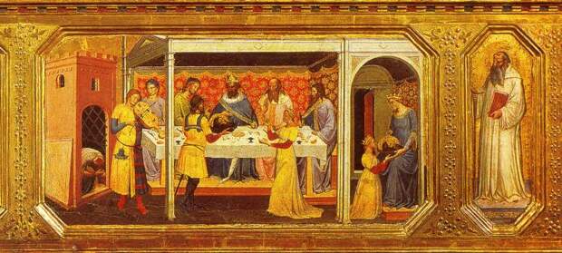 Мужчину с блюдом мы видим и на другой старинной картине "Пир Ирода" Джованни ди Паоло, якобы 1453 года. Воин-мужчина в латах, с мечом на боку становится на колени и подносит на блюде голову Иоанна царю Ироду, см. рис.p2.14. Сзади стоит Саломея.