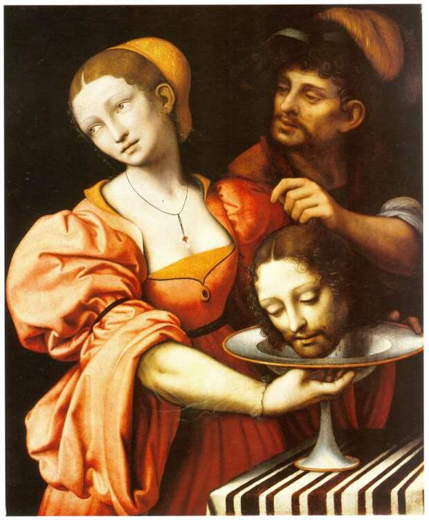 Кстати, теперь, вероятно, становится понятной и существовавшая старинная традиция, согласно которой рядом с Саломеей, Иродиадой и блюдом с головой Иоанна обычно изображался также и ВОИН С МЕЧОМ, отрубивший ему голову, см. рис.p2.8, рис.p2.9, рис.p2.10. Может быть, тут мы сталкиваемся со смутным воспоминанием, что БЛЮДО было на самом деле именем воеводы, убившего Ярополка = Иоанна Крестителя.