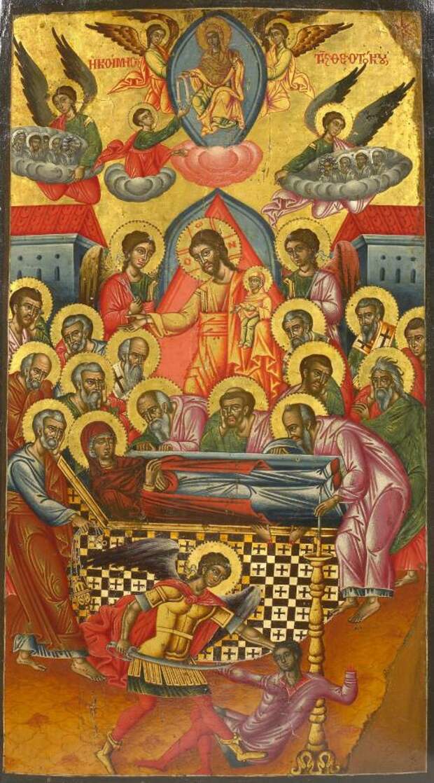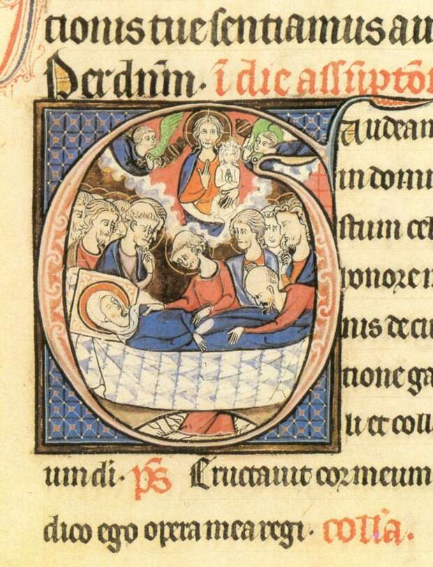# Наконец, согласно христианской традиции, Дева Мария не умерла, а воскресла, вознеслась, была взята небо [298:1], с.102. См. рис.5.15. То же самое сообщается и про Деву Ифигению. Боги даровали ей бессмертие, см. выше. Причем после того, как Дева Ифигения "почти-что погибла" на жертвенном алтаре. Но потом неожиданно спаслась.