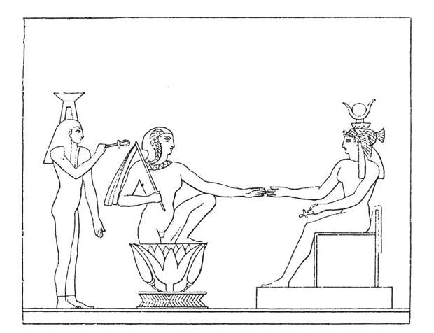 - старинное изображение Младенца Гора (Христа) на цветке лотоса. Наверное, показано крещение Иисуса в купели. Фигура слева (Иоанн Креститель) подносит христианский крест "с ушком". Такой же крест - в руках женщины справа. Вероятно, это Дева Мария. На ее голове - полумесяц со звездой (солнцем). Впрочем, может быть, тут изображено Рождество: юный Иисус находится еще в своей колыбели, но, взрослея, встает из нее.