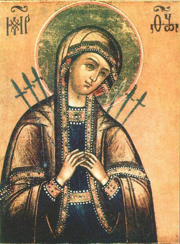 Именно поэтому мы указывали в книге "Царский Рим в Междуречье Оки и Волги" на христианские изображения вроде известной иконы Богоматери под названием "Семистрельная", рис.5.13, а также иконы "Умягчение злых сердец". См. также рис.5.14. Комментаторы пишут так: <<Пророчество святого Симеона... символически изображалось на "Семистрельной" иконе. СЕМЬ МЕЧЕЙ, ПРОНЗИВШИХ СЕРДЦЕ ПРЕСВЯТОЙ БОГОРОДИЦЫ... Между иконами "Умягчение злых сердец" (называемой также "Симеоново проречение") и "Семистрельная" есть небольшое различие - мечи расположены на них по-разному>> [963], с.137-138.