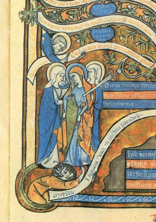 По-видимому, здесь мы натолкнулись на легкое искажение первоначального текста, согласно которому ДЕВСТВЕННИЦА БЫЛА УБИТА МЕЧОМ, принесена в жертву. Напомним, что некоторые старинные авторы, вероятно, путали кесарево сечение, сделанное Марии Богородице, с ее Успением. В христианской традиции известны евангельские слова, обращенные к Марии: "Тебе Самой ОРУЖИЕ ПРОЙДЕТ ДУШУ" (Лука 2:35). Эти слова произносит Симеон, благословляя Деву Марию, когда она и Иосиф принесли Младенца Христа в храм, "чтобы совершить над Ним законный обряд" (Лука 2:27). Ангел на иконах Успения, наносящий удар мечом около Марии, - и поражая будто бы Афония, рис.5.12, - мог символизировать слова: "Тебе Самой оружие пройдет душу". Может быть, здесь мы наталкиваемся на соответствие с ножом, который пронзил тело Марии. То есть с кесаревым сечением.