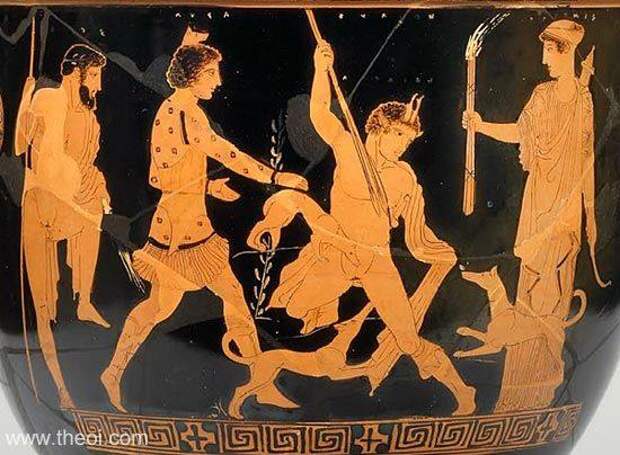 .. Благодаря великим аттическим трагикам, обрабатывавшим этот сюжет, наиболее распространенной версией мифа стала следующая. Ифигения - дочь Агамемнона и Клитемнестры (или приемная дочь их). Когда греки отправлялись под Трою, и готовы были уже пуститься в путь из беотийской гавани Авлиды, Агамемнон (или Менелай) оскорбил Артемиду, убив на охоте посвященную ей лань. За это богиня наслала безветрие, и флот греков не мог двинуться в путь. Прорицатель Калхас объявил, что богиня может быть умилостивлена только ПРИНЕСЕНИЕМ ЕЙ В ЖЕРТВУ ИФИГЕНИИ. Агамемнон, по настоянию Менелая и войска, должен был согласиться на это, и Ифигения была вытребована в лагерь, под предлогом обручения с Ахиллом.Когда она прибыла туда и ВСЕ УЖЕ БЫЛО ГОТОВО ДЛЯ ЖЕРТВЫ, АРТЕМИДА СЖАЛИЛАСЬ И В САМЫЙ МОМЕНТ ЗАКЛАНИЯ ЗАМЕНИЛА ИФИГЕНИЮ КОЗОЙ, А ЕЕ НА ОБЛАКЕ ПОХИТИЛА И УНЕСЛА В ТАВРИДУ, где Ифигения сделалась ее жрицей и умерщвляла перед ее алтарем странников, заносимых туда бурей (рис.5.11 - Авт.). Здесь нашел Ифигению брат ее Орест, который прибыл в Тавриду, вместе с другом своим Пиладом, по приказанию дельфийского оракула, чтобы увести в Элладу изображение Артемиды Таврической, упавшее, по преданию, с неба. Они вместе возвратились на родину.