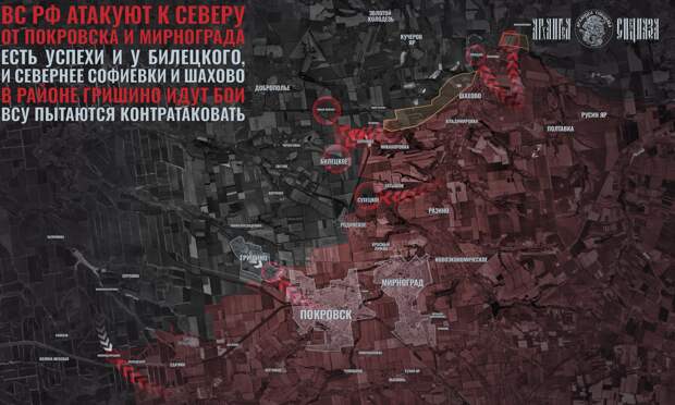 С освобождением одной из ключевых агломераций в ДНР наши войска не остановили наступление. Это касается и противника, который усиленно укрепляет новую линию обороны на рубеже Гришино – Билецкое – Торецкое. В районе Гришино фиксируются бои. Наши войска постепенно увеличивают натиск на село и пытаются пробиться в центр. ВСУ намерены контратаковать с целью выбить наши войска. Подразделения 425-го штурмового полка «Скала» и 157-й ОМБр накапливают силы в районе 3 км севернее Красноармейска. Также отмечаются подразделения 4-го отряда СпН 71-й ОЕБр ДШВ в восточном районе Гришино. Чуть севернее наши подразделения развивают успех со стороны Дорожного в направлении Нового Донбасса и Билецкого, где бои отмечаются уже на окраинах этих сёл.