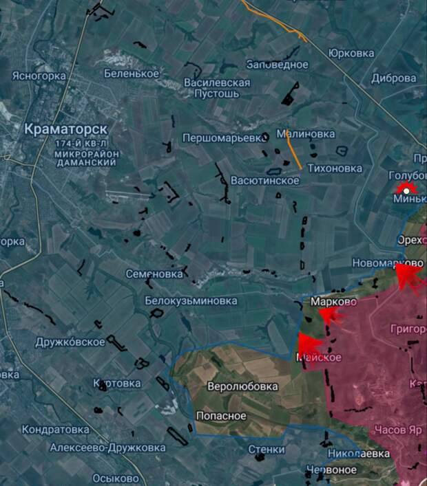 Российские войска продвигаются севернее от Часова Яра. Под контроль Вооружённых сил России перешло село Новомарково и до 11 квадратных километров окрестных территорий. Новомарково находится на западном берегу канала Северский Донец-Донбасс и к западу от автодороги Артёмовск-Славянск. Также российские войска ведут бой за соседнюю Миньковку. Рядом с этим селом находится роща, где противник организовал свои огневые позиции, являющиеся частью южной линии обороны для Славянско-Краматорской агломерации. От передовых позиций ВС РФ в районе освобождённого Новомарково до юго-восточной окраины Краматорска около 16 км, пишет Телеграм-канал «Дневник десантника».