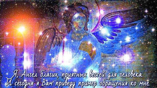 Я, Ангел благих, приятных вестей для человека. И сегодня я приведу Вам пример обращения ко мне. Разумеется, у каждого из Вас имеются свои неразрешённые вопросы и слова у Вас будут своими, идущими из сердца. Проговаривайте в состоянии медитативном, это необходимо для реализации Ваших просьб, ибо мысли сторонние не будут препятствовать прохождению нейроимпульсов в заданное пространство, т.е. во Вселенную. Слова изливайте искренне, словно Вы их говорите Отцу Небесному или Матери Космической.