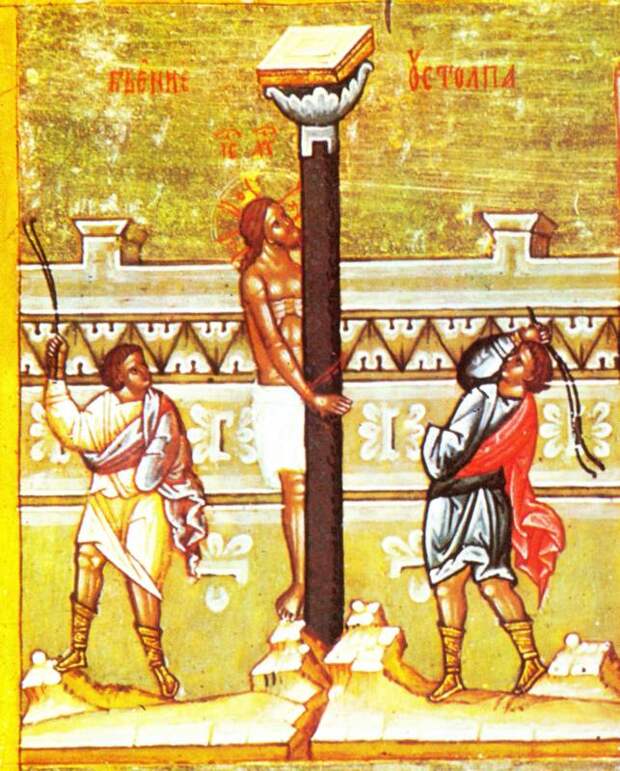 РУССКАЯ ИСТОРИЯ: Итак, русские хроники прямым текстом упоминают о СТОЛБЕ, РЯДОМ С КОТОРЫМ СТОЯЛ АНДРЕЙ БОГОЛЮБСКИЙ И МОЛИЛСЯ БОГУ В МОМЕНТ СВОЕЙ ГИБЕЛИ. По-видимому, перед нами - евангельская сцена распятия Христа на кресте или столбования Христа, то есть привязывания его к столбу. См., например, икону на рис.3.29, где показано бичевание Христа. Подобных старинных изображений много. По поводу того, что некоторые старинные свидетельства, сообщая о казни Иисуса, имели в виду именно его СТОЛБОВАНИЕ, см. книги "Основания истории", гл.7:6.4, и "Методы". Поэтому появление на страницах русских летописей некоего СТОЛБА, около которого стоит и погибает князь Андрей Боголюбский, согласуется с Евангелиями.