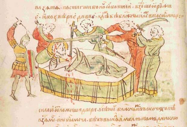"Он же, ОЧНУВШИСЬ, ВСТАЛ И ПОШЕЛ ЗА НИМИ, стоная, желая рабов своих, во дворе бывших, созвать. Что злодеи услышали, поворотились к нему, а он, видя их, побежал под сени. Но так как темно было, и злодеи оные, видя, что никто на них, слыша шум и крик княжий, не идет, зажгли огонь и стали искать его без опасения. И видя ЕГО ЗА СТОЛБОМ КРЫЛЕЧНЫМ СТОЯЩЕГО И МОЛЯЩЕГОСЯ К БОГУ, ТУТ ЗАКОЛОЛИ ЕГО" [832:1], т.2, с.367.