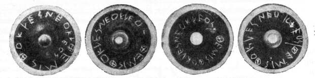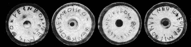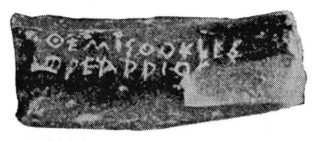 Кстати, сегодня нам показывают даже несколько ОСТРАКОНОВ для голосования с именем Фемистокла. Считается, что на них написано "Фемистоклес Неоклеос", хотя буквально написано следующее: "ФЕМИС ФОКЛЕС НЕОКЛЕС", рис.4.36 и рис.4.37. Якобы их нашли в древнем колодце на афинском Акрополе. Еще один острак-черепок с именем Фемистокла показан на рис.4.38. Подлинность этих черепков, а главное - их отношение к Фемистоклу, сомнительны. Во всяком случае, как мы уже понимаем, Афины эпохи Фемистокла-Иуды и Пелопоннесской войны - это Царь-Град = Троя = Иерусалим XII века. Так что если голосование об изгнании Иуды-Фемистокла и происходило, то, скорее всего, - в Царь-Граде.