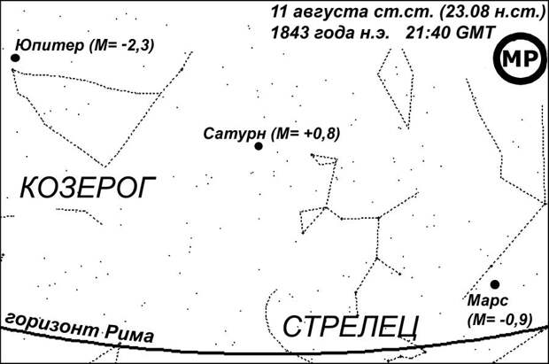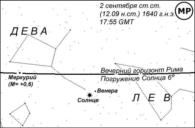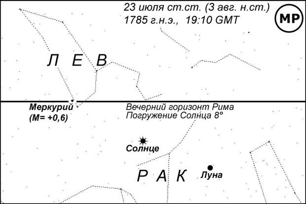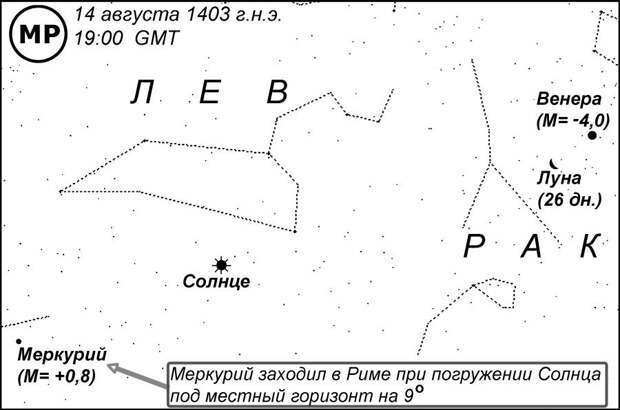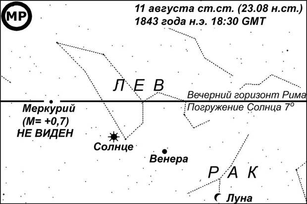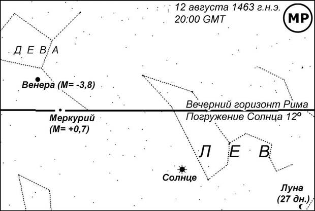 , на котором представлен вечерний горизонт Рима во время захода Меркурия. Погружение Солнца в этот момент составляло уже 12 градусов дуги. Это значит, что наступила темнота, достаточная, чтобы стали видны не только планеты, но и большинство звезд, кроме самых слабых, которые становятся видны при погружении Солнца на 18 градусов [НХЕ]. Яркость Меркурия составляла М= +0,7, как у звезды первой величины, поэтому он был заведомо виден. Венера с яркостью М = -3,8 к тому времени еще не зашла и была прекрасно видна. Луна имела возраст 27 дней и была видна в виде узкого серпа на утреннем небе. Все остальные планеты находились далеко от Солнца и, следовательно, были видны ночью. Само Солнце видно всегда (днем).