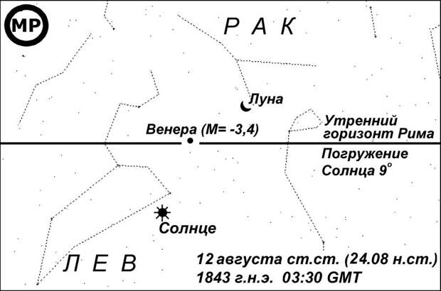 показан утренний горизонт Рима во время восхода Венеры в решении 1843 года н.э. Венера всходила при погружении Солнца под местный горизонт на 9 градусов дуги. Яркость Венеры М = -3,4 была, как обычно, очень высокой, что обеспечивало ее отчетливую видимость невооруженным глазом при таком погружении Солнца [НХЕ]. Луна всходила раньше Венеры и тоже была видна, поскольку новолуние еще не наступило. Возраст Луны составлял 27 дней.