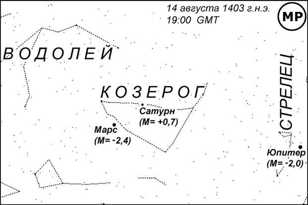5) РЕШЕНИЕ 1403 ГОДА в целом не противоречит первому дополнительному условию, но не удовлетворяет второму. Первое условие выполнено "на троечку", поскольку Сатурн находился в середине Козерога, то есть не очень далеко от Водолея, рис.207