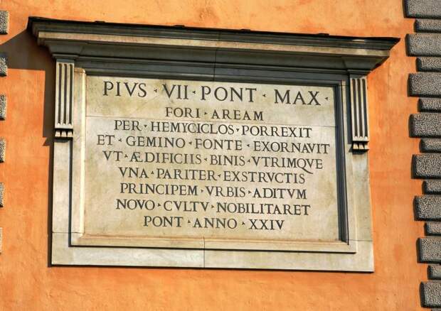 PIVS VII PONT MAX FORI AREAM PER HEMYCICLOS PORREXIT ET GEMINO FONTE EXORNAVIT VT AEDIFICIIS BINIS VTRIMQVE VNA PARITER EXSTRVCTIS PRINCIPEM VRBIS ADITVM NOVO CVLTV NOBILITARET PONT ANNO XXIV