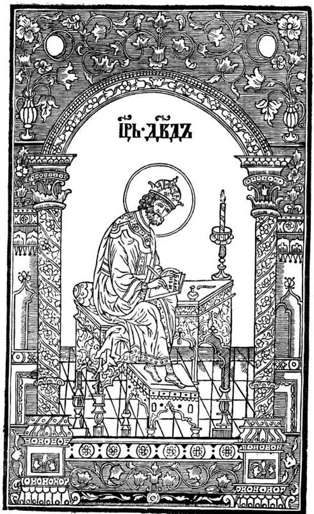 Напомним вкратце, что известно об авторе Псалтыри. Традиционно считается, что им был святой царь и пророк Давыд. Так, например, общее заглавие раздела псалмов в старопечатных московских Псалтырях выглядит так: "ДАВЫДА ПРОРОКА И ЦАРЯ ПЕСНЬ" [701], л.12. То есть, Псалтырь - книга песен царя Давыда. Отметим, что начиная с XVII века имя "Давыд" стали писать несколько по-другому - "Давид", а вместо старого "Псалтырь" начали писать "Псалтирь". Но поскольку речь в этом разделе пойдет в основном о старопечатной Псалтыри, мы будем придерживаться здесь старого русского написания слов "Давыд" и "Псалтырь" [701].