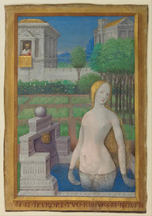 Купание Вирсавии. Миниатюра из «Часослова Людовика XII Французского». Миниатюра иллюстрирует момент из Ветхого Завета, описанный во Второй Книге Царств: царь Давид видит, как Вирсавия купается, и, будучи очарован ее прелестями, вступает с ней в плотскую связь. Ну а для того, чтобы жениться на Вирсавии и этим самым покрыть свой грех, он отправляет ее мужа Урию на войну, приказав своим военачальникам бросить его на верную смерть. Музей Гетти
