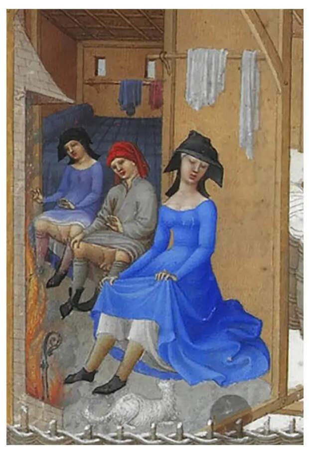 Но вот на этом увеличенном фрагменте этой миниатюры очень хорошо видно, что художники почему-то на двух участниках этой сцены почему-то не нарисовали нижнего белья. Мы видим, что они все втроем греются возле пылающего очага (вместе с кошкой), вот только у двух персонажей – юноши и девушки, под верхней одеждой почему-то ничего нет? Неужели, имея такое хозяйство, они были настолько бедны, что не могли себе позволить даже этого?