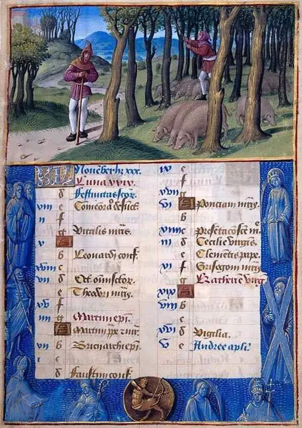 Ноябрь. «Часослов Генриха VIII».На полях листа часослова изображены святые, чья память чтится в ноябре. Смерть в виде скелета ко Дню всех усопших. А ещё в ноябре свиней пасли в дубовых лесах, как раз в ноябре сбрасывавших желуди…