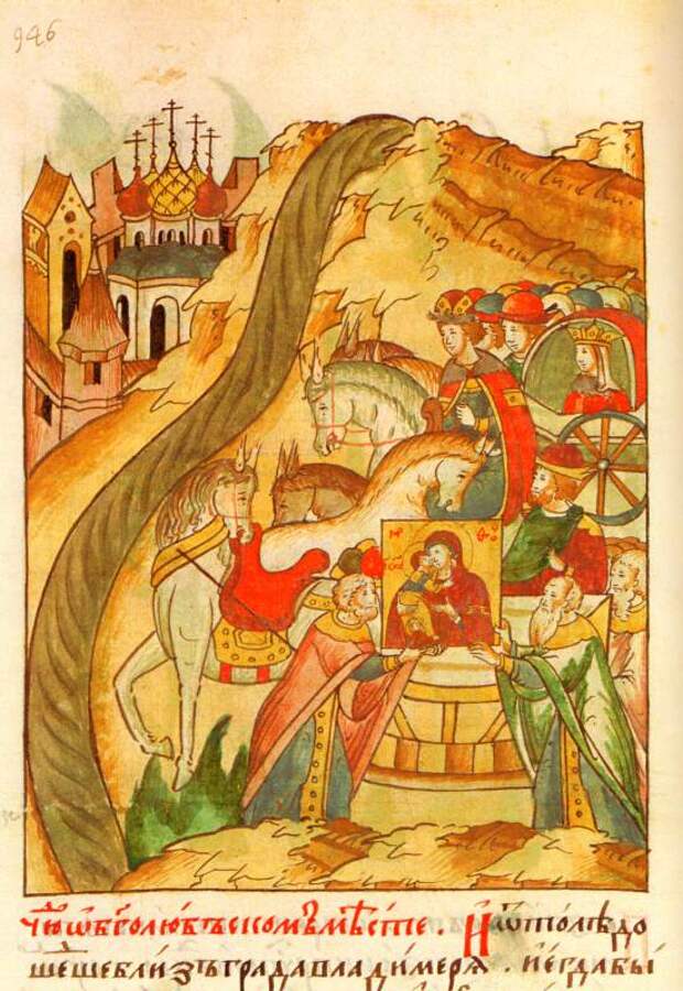 Он поспешил в монастырь и там упал перед святым изображением с усердной молитвой, прося Пречистую быть ему Заступницей и Помощницей в Суздальской земле (во время бегства во Владимиро-Суздальскую Русь - Авт.). С молебным пением он поднял своими руками чудотворный образ и НОЧЬЮ ВЫШЕЛ из Вышгорода со своей княгиней, с боярами и со многими людьми (см. старинную миниатюру на рис.3.15- Авт)...