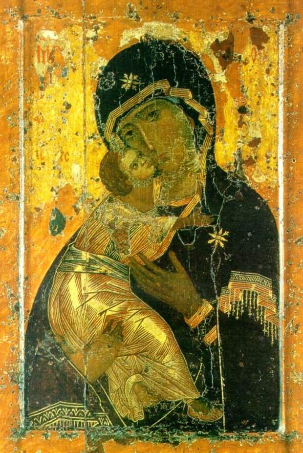 В Вышгороде (вероятно, Царь-Граде - Авт.) существовал женский монастырь, и в нем находилась древняя икона Богоматери, написанная, по преданию, евангелистом Лукой и принесенная им Богородице во время Ее земной жизни... Икона эта в половине пятого века (якобы - Авт.) при греческом императоре Феодосии Младшем была перенесена из Иерусалима в Царь-Град (согласно нашей реконструкции, Царь-Град и называли Иерусалимом - Авт.), а в половине XII века привезена оттуда в дар Юрию Долгорукому>> [578], кн.2, с.483-487. На рис.3.14 показана чудотворная Владимирская икона Божьей Матери.