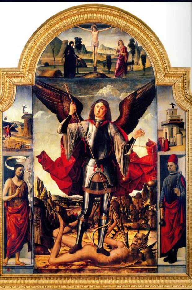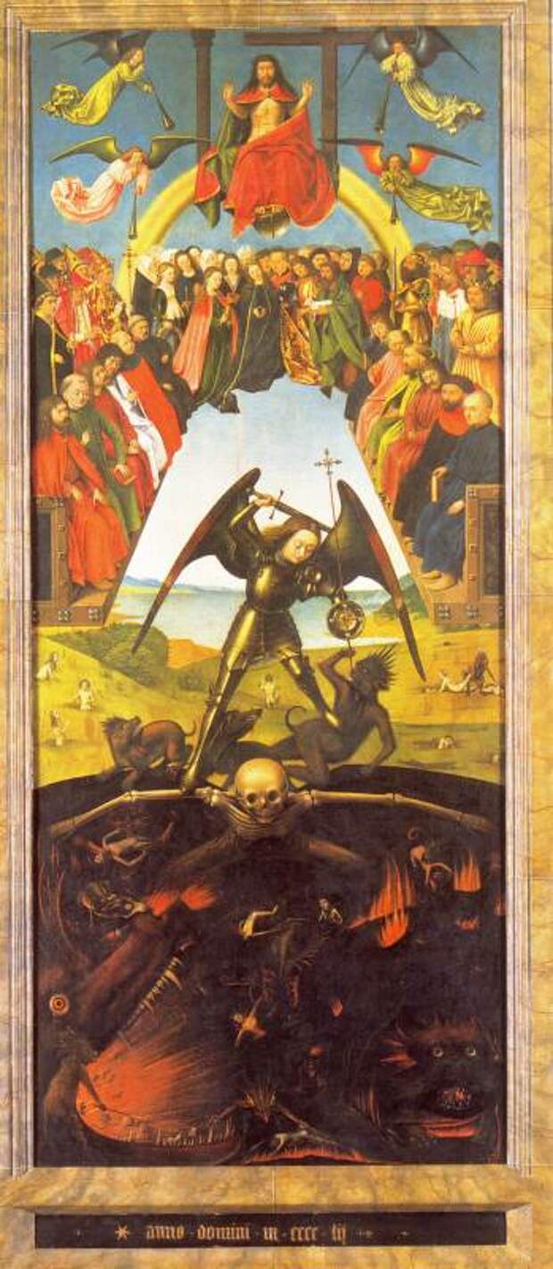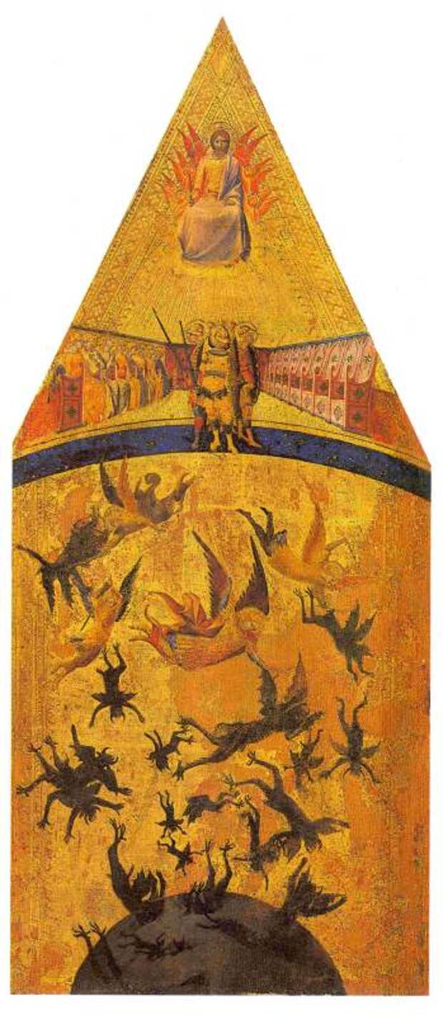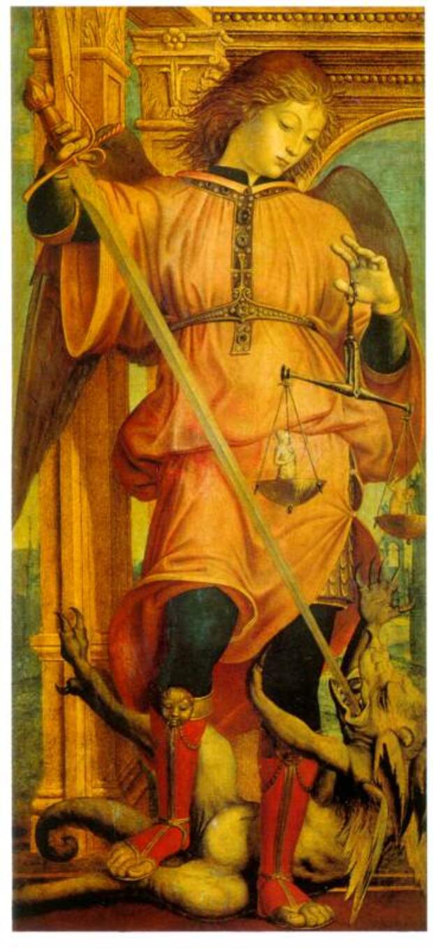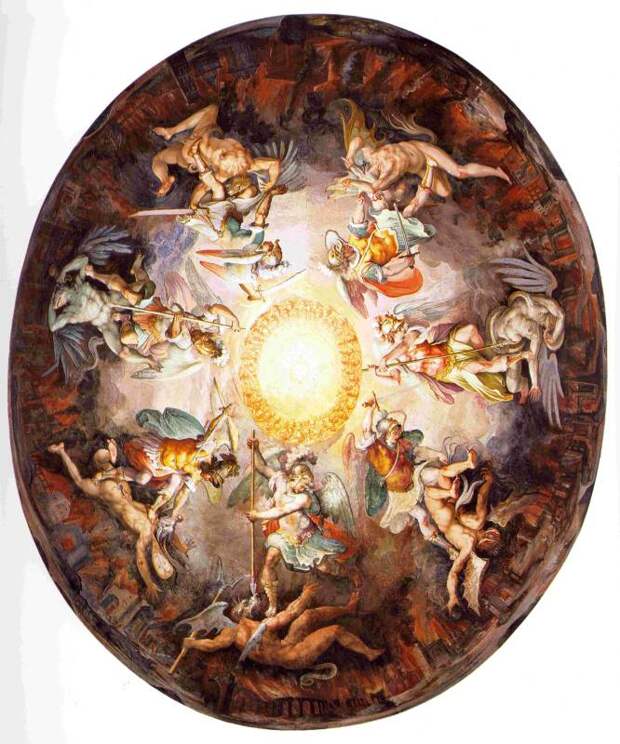 Когда Бог создал мир, ему служили Ангелы. Главным Ангелом был Сатанаил или Сатана или Шайтан (переход С-Ш). Сатана возгордился и захотел стать равным Богу. Он увлек с собой часть Ангелов. Другими словами, Сатана поднял ангельский мятеж против Бога. Воинство Ангелов, защищающих Бога, возглавил архангел Михаил. Между восставшими Ангелами Сатаны и оставшимися верными Богу Ангелами произошла битва. Архангел Михаил победил, см. рис.2.44 и рис.2.45. Сатана, вместе со своими приверженцами, был низвергнут и "скован", см. рис.2.46. Говорится, что перед концом света Сатана выйдет из оков и будет править миром до второго пришествия Христа.