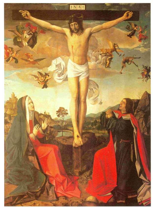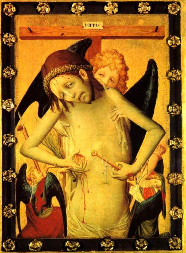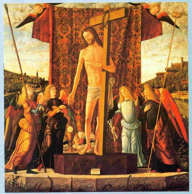 Рис.2.64. "Христос с четырьмя ангелами". Карпаччо. Якобы XV век. Взято из [368], с.37. Два ангела держат в руках орудия казни Христа - копье и шест с губкой.