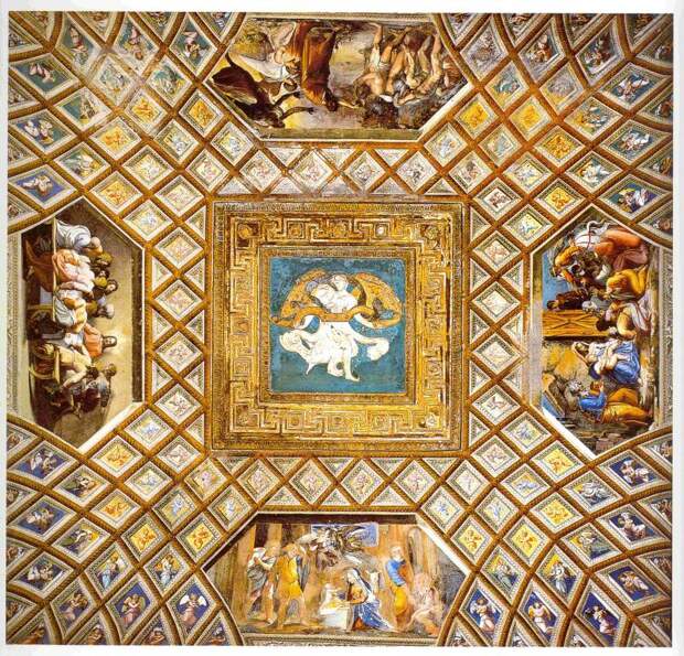 Это объясняет - почему на потолке Лоджии Рафаэля в Ватикане несколько раз изображены именно лук и венец. Причем в прямой связи со Священной историей и, в частности, с Христом.