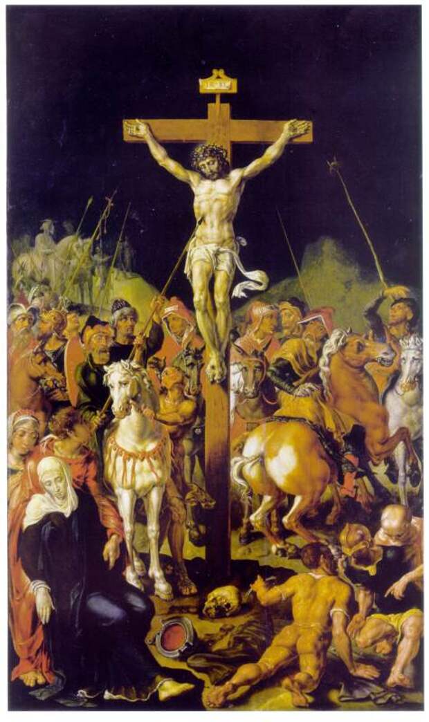 Рис.2.63a. Мартин ван Хемскерк. "Голгофа". Нидерланды. XVI век. Здесь представлены многие сюжеты, которые мы обсуждаем в нашей книге. А именно: надпись на кресте; удар копьем в правый бок Христа; губка с уксусом, поданная Христу; череп Адама у основания креста; римские воины, разыгрывающие в кости одежды Христа; большое скопление народа вокруг места казни. Взято из [990:1], с.148.