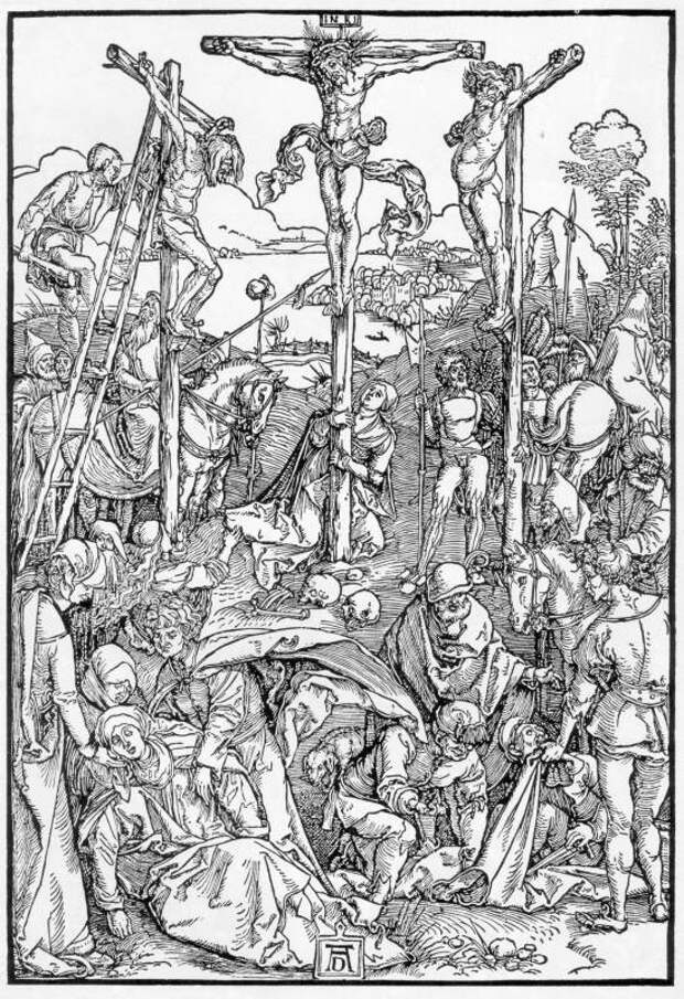 Рис.2.62. "Распятие". Альбрехт Дюрер. Всадник слева держит копье, а в руках воина, стоящего за ним, - палка с губкой на конце. Взято из [1234], илл.192.