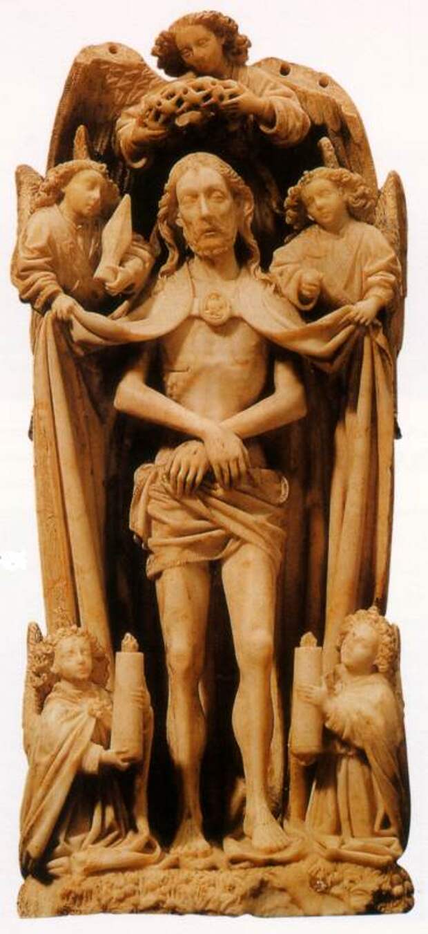 На рис.2.52a показана скульптура <<"Муж скорбей", или Христос с ангелами, держащими орудия страстей>>. Мы уже привели ряд изображений, где орудия казни находятся не в руках римских воинов, казнивших Христа, а в руках ангелов. Сегодня они толкуются в иносказательном смысле. Дескать, ангелы держат орудия казни как напоминание о Страстях Господних. Однако, не исключено, что мы наталкиваемся на явный след подлинных событий XII века, когда Андроника-Христа действительно предали Ангелы, сначала служившие ему, но потом изменившие. Причем мятеж возглавил Исаак АНГЕЛ.