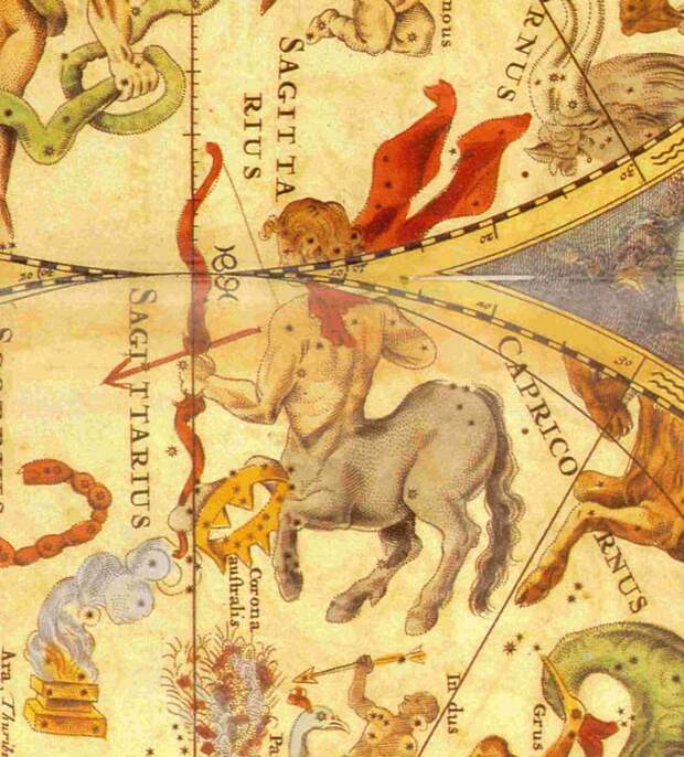 Итак, что мы имеем? В старой летописи, которую переписывал "Хониат", про Андроника, по-видимому, было сказано, что "Кентавр стрелял из лука". Событие было настолько знаменитым, что впоследствии само слово "кентавр" стало нарицательным. Так стали называть всадника, стреляющего из лука. Этот же Кентавр-Стрелец, вероятно, вошел и в число зодиакальных созвездий. Одно из них так и называется - Стрелец, и изображается в виде Кентавра, см. рис.2.59. Напомним, что латинское название созвездия Стрельца - КЕНТАВР (Centaurus). Например, так назван Стрелец в знаменитом Альмагесте Птолемея.