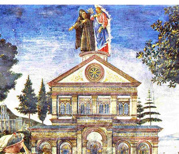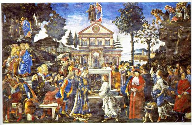На рис.2.51 приведена картина Боттичелли "Сцены из жизни Христа: Искушение Христа; Очищение прокаженного". В самом ее центре изображен храм, на крыше которого стоят Христос и искушающий его Сатана. Очень любопытно, что Сатана представлен здесь не в фантастически-сказочном виде (рога, копыта и т.п.), а как обычный человек, см. рис.2.52. Он одет в монашеское одеяние, в его руках посох. Вероятно, во времена Боттичелли еще помнили (хотя уже смутно), что в Евангелиях описана беседа Исаака Ангела с Андроником.