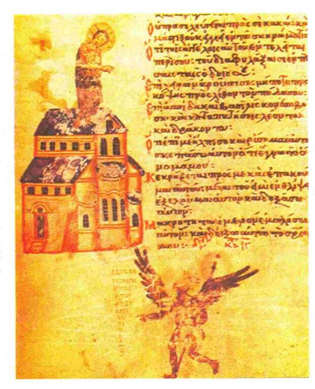 Возведение Христа на крыло храма Сатаной - это вынужденное прибытие Андроника в Царь-Град, когда он взошел на подкупольную галерею храма Святой Софии. Отсюда, сверху, он видит Исаака Ангела - нового царя. По-видимому, между ними произошел какой-то разговор. И ЕВАНГЕЛИЯ ПОДРОБНО ПЕРЕДАЮТ НАМ ЭТУ БЕСЕДУ В ВИДЕ РАЗГОВОРА ХРИСТА С САТАНОЙ. Рассказывается о том, как Сатана - Исаак предлагает Христу-Андронику высокие должности в обмен на то, что тот признает себя побежденным и поклонится ему. Христос-Андроник отказывается и уходит. На старинном рисунке мы видим изображение этой сцены, см. рис.2.50. Христос стоит на самой крыше храма, а внизу, на площади, находится Сатана. Они беседуют.