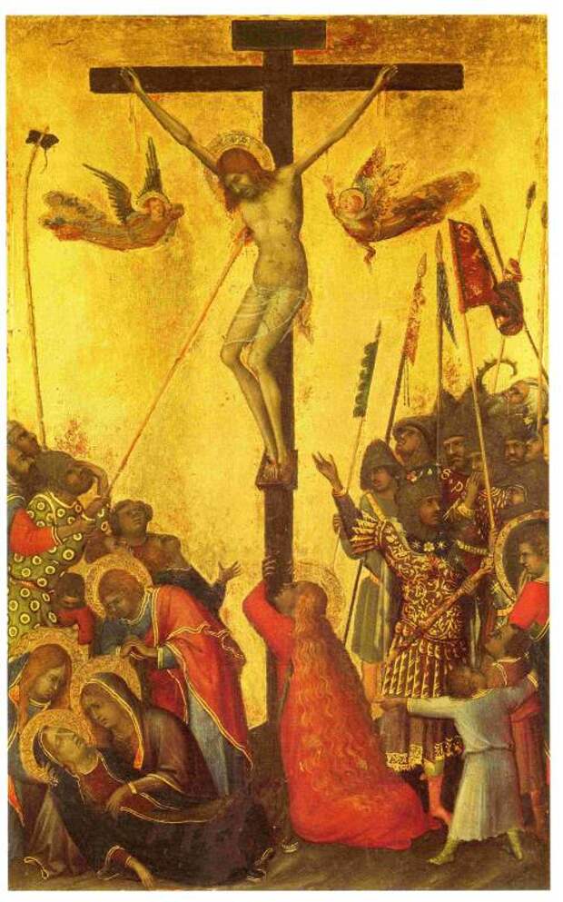 Рис.2.63. "Распятие". Симоне Мартини. Якобы XIV век. Воин слева наносит удар копьем Христу в бок. Другой воин держит на палке губку с уксусом. Взято из [993:1], с.74, илл.76.